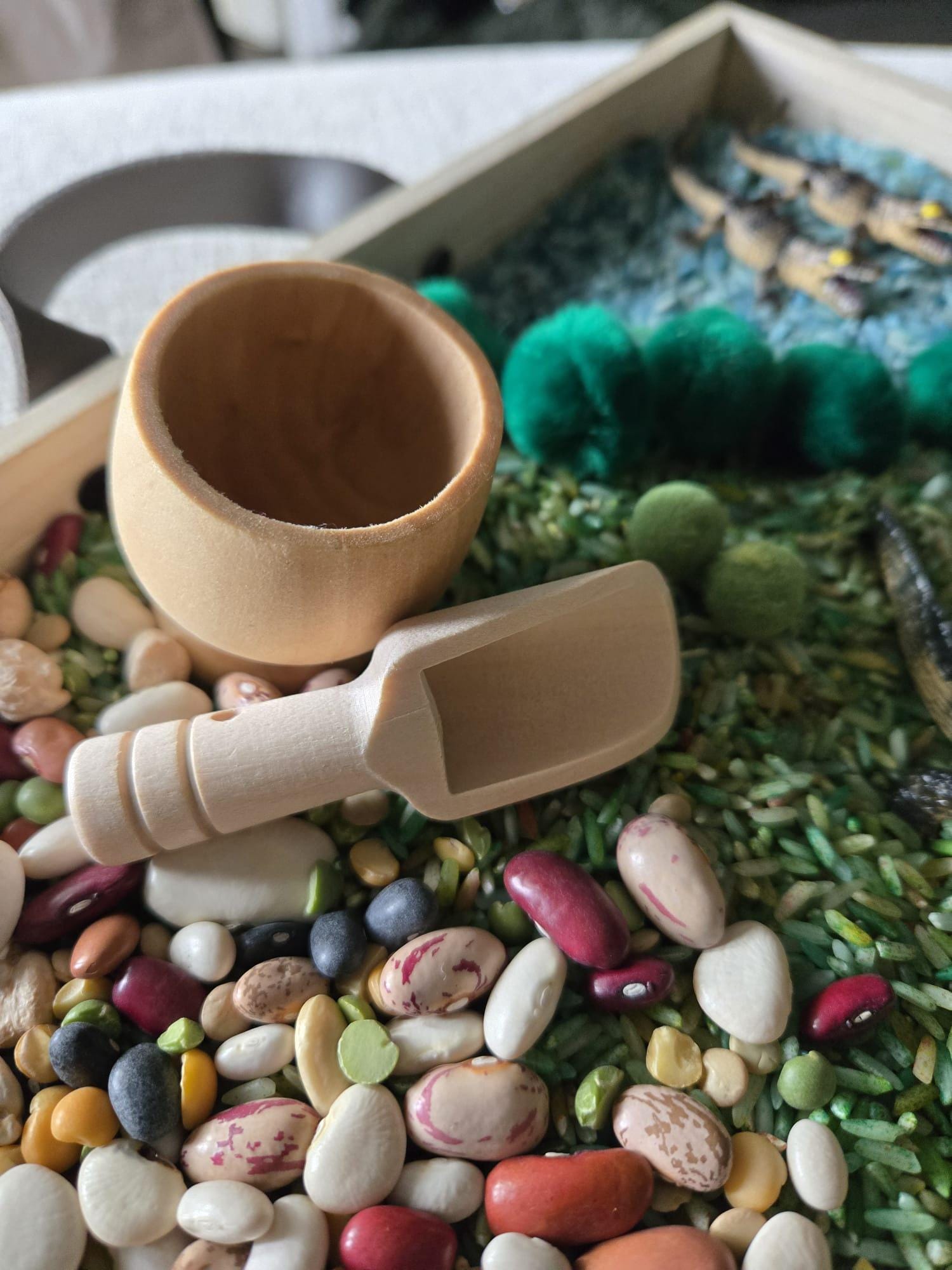 Base Material: Blue and green dyed rice mixed with beans to represent land and water textures. Comes with pom-poms, a small scoop, and a bowl for pouring and sensory fun.