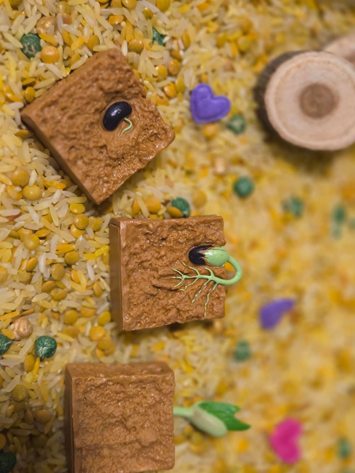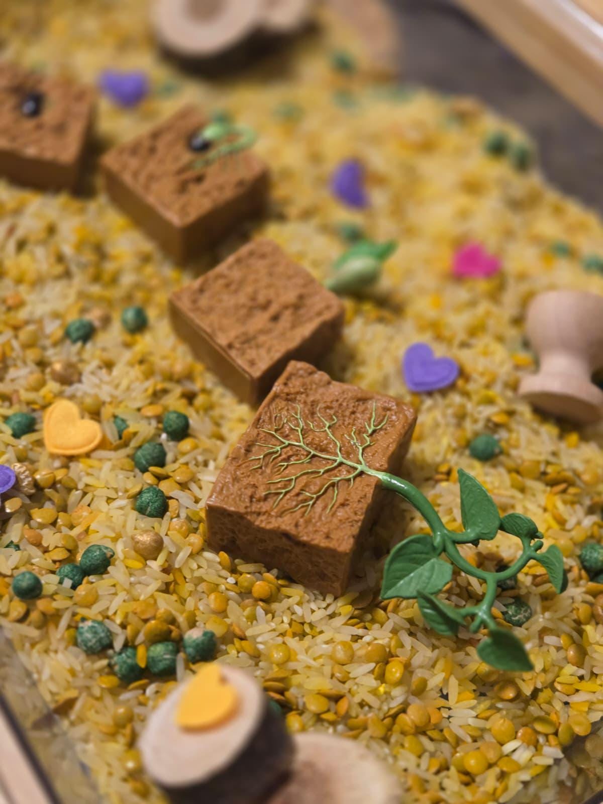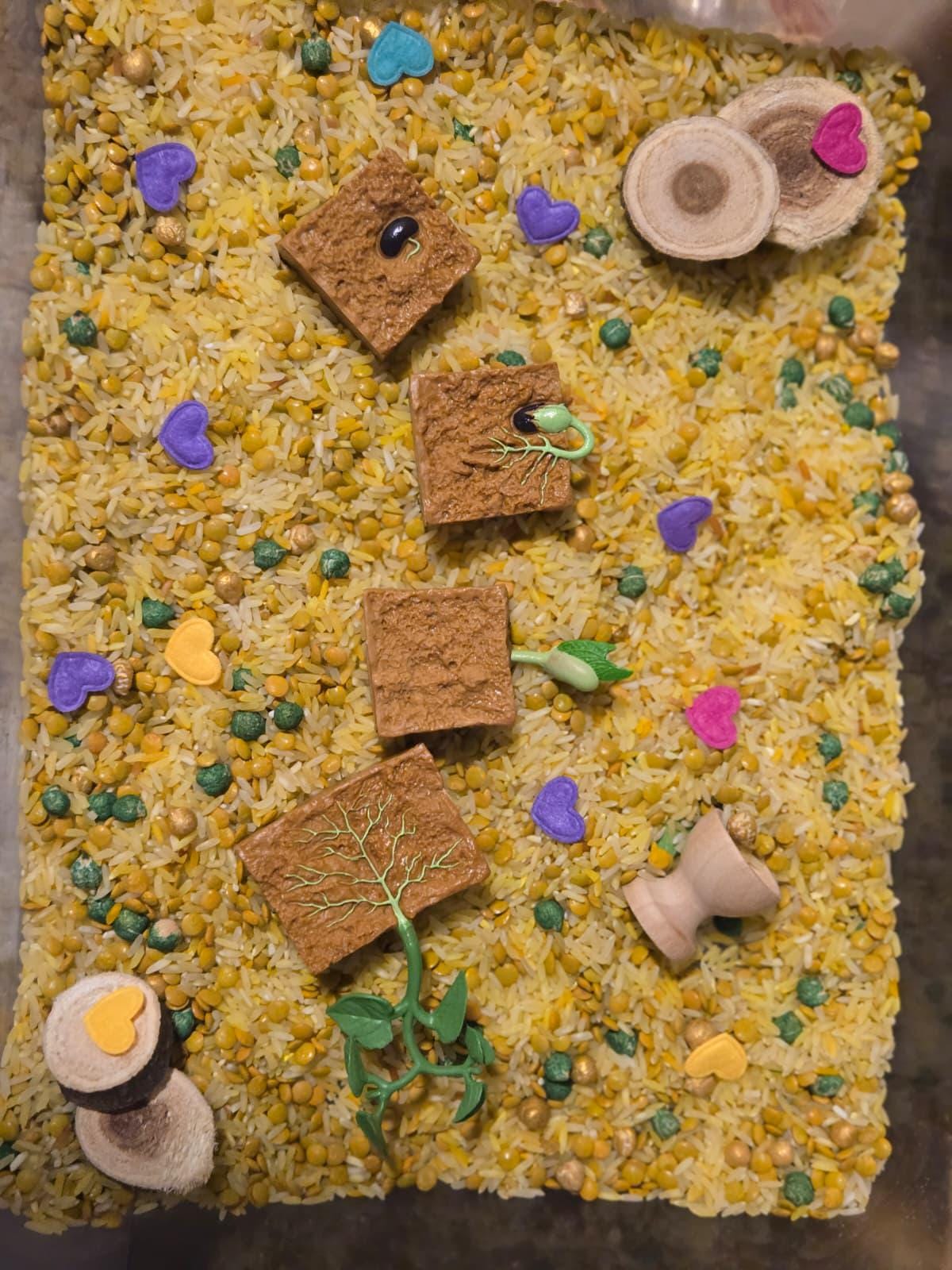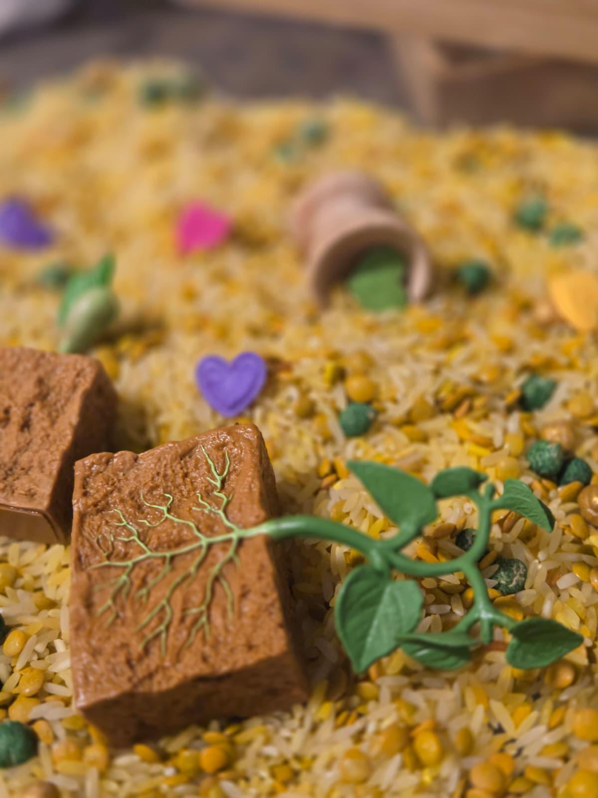 Base Material: Yellow-dyed rice with 1 chickpea hidden inside as a “special seed” for children to find. The dyed rice provides a calming sensory base, perfect for scooping, pouring, and imaginative planting play.